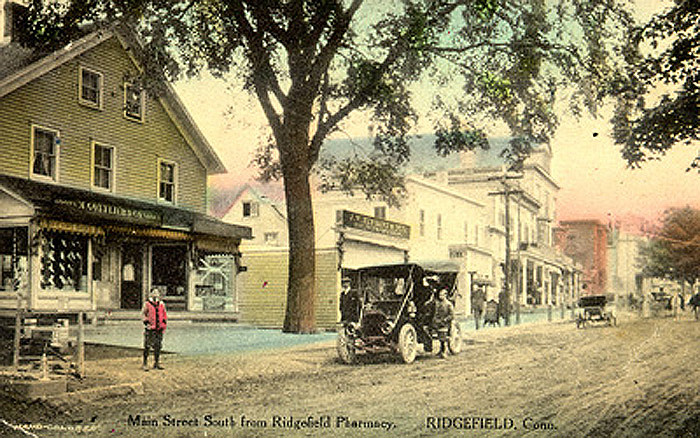 This view shows the east side of Main Street, a little north of Bailey Avenue, around 1910. At left is Gottlieb's shoe store, which today is the Raveis Real Estate office. Right behind the car is Hibbart's Market which, with a couple of nearby buildings, was destroyed in a fire around 1930. Nonetheless, the scene today looks very much like this, except for the lack of the magnificent elm. The town hall is the reddish building down the street.
